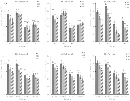 The crude fat content of maize/sorghum and alfalfa in 2019–2020 (the 1st round) (R1), 2020–2021 (the 2nd round) (R2), and 2021–2022 (the 3rd round) (R3). D1 represents suitable sowing, D2 represents suitable delayed sowing, and D3 represents late sowing. M1 represents maize Dongdan 60, M2 represents maize Dongdan 1331, S1 represents sorghum 1230, and S2 represents sorghum cfsh30. A (M1) represents alfalfa following the preceding crop of maize Dongdan 60, A (M2) represents alfalfa following the preceding crop of maize Dongdan 1331, A (S1) represents alfalfa following the preceding crop of sorghum 1230, and A (S2) represents alfalfa following the preceding crop of sorghum cfsh30. Means followed by the same letters do not differ by Tukey’s test (p > 0.05).
