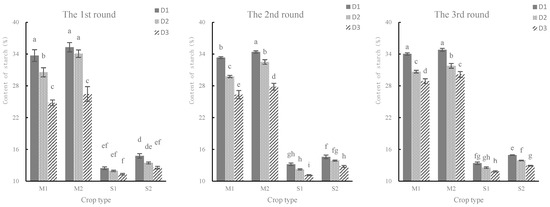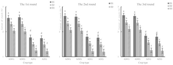 The starch content of maize/sorghum and alfalfa in 2019–2020 (the 1st round) (R1), 2020–2021 (the 2nd round) (R2), and 2021–2022 (the 3rd round) (R3). D1 represents suitable sowing, D2 represents suitable delayed sowing, and D3 represents late sowing. M1 represents maize Dongdan 60, M2 represents maize Dongdan 1331, S1 represents sorghum 1230, and S2 represents sorghum cfsh30. A (M1) represents alfalfa following the preceding crop of maize Dongdan 60, A (M2) represents alfalfa following the preceding crop of maize Dongdan 1331, A (S1) represents alfalfa following the preceding crop of sorghum 1230, and A (S2) represents alfalfa following the preceding crop of sorghum cfsh30. Means followed by the same letters do not differ by Tukey’s test (p > 0.05).