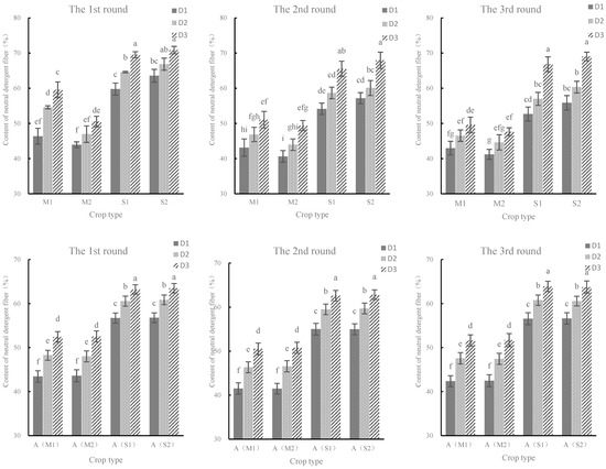 The neutral detergent fiber content of maize/sorghum and alfalfa in 2019–2020 (the 1st round) (R1), 2020–2021 (the 2nd round) (R2), and 2021–2022 (the 3rd round) (R3). D1 represents suitable sowing, D2 represents suitable delayed sowing, and D3 represents late sowing. M1 represents maize Dongdan 60, M2 represents maize Dongdan 1331, S1 represents sorghum 1230, and S2 represents sorghum cfsh30. A (M1) represents alfalfa following the preceding crop of maize Dongdan 60, A (M2) represents alfalfa following the preceding crop of maize Dongdan 1331, A (S1) represents alfalfa following the preceding crop of sorghum 1230, and A (S2) represents alfalfa following the preceding crop of sorghum cfsh30. Means followed by the same letters do not differ by Tukey’s test (p > 0.05).