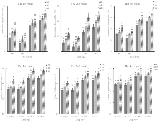 The acid detergent fiber content of maize/sorghum and alfalfa in 2019–2020 (the 1st round) (R1), 2020–2021 (the 2nd round) (R2), and 2021–2022 (the 3rd round) (R3). D1 represents suitable sowing, D2 represents suitable delayed sowing, and D3 represents late sowing. M1 represents maize Dongdan 60, M2 represents maize Dongdan 1331, S1 represents sorghum 1230, and S2 represents sorghum cfsh30. A (M1) represents alfalfa following the preceding crop of maize Dongdan 60, A (M2) represents alfalfa following the preceding crop of maize Dongdan 1331, A (S1) represents alfalfa following the preceding crop of sorghum 1230, and A (S2) represents alfalfa following the preceding crop of sorghum cfsh30. Means followed by the same letters do not differ by Tukey’s test (p > 0.05).