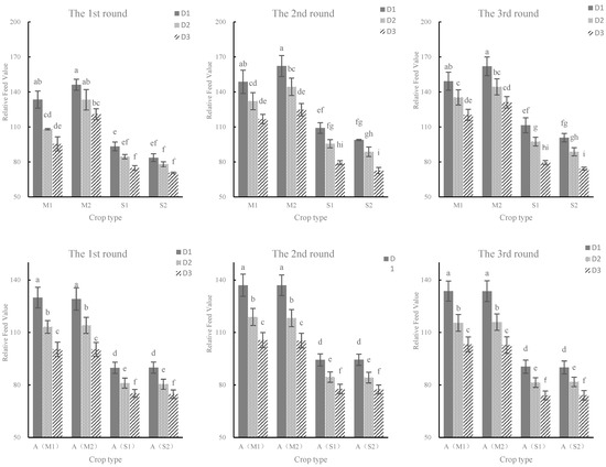 The relative feeding value of maize/sorghum and alfalfa in 2019–2020 (the 1st round) (R1), 2020–2021 (the 2nd round) (R2), and 2021–2022 (the 3rd round) (R3). D1 represents suitable sowing, D2 represents suitable delayed sowing, and D3 represents late sowing. M1 represents maize Dongdan 60, M2 represents maize Dongdan 1331, S1 represents sorghum 1230, and S2 represents sorghum cfsh30. A (M1) represents alfalfa following the preceding crop of maize Dongdan 60, A (M2) represents alfalfa following the preceding crop of maize Dongdan 1331, A (S1) represents alfalfa following the preceding crop of sorghum 1230, and A (S2) represents alfalfa following the preceding crop of sorghum cfsh30. Means followed by the same letters do not differ by Tukey’s test (p > 0.05).