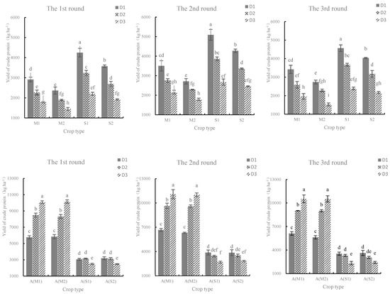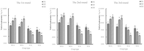 Crude protein yield of maize/sorghum and alfalfa in 2019–2020 (the 1st round) (R1), 2020–2021 (the 2nd round) (R2), and 2021–2022 (the 3rd round) (R3) including double-cropping systems maize Dongdan 60–alfalfa WL525 (M1–A), maize Dongdan 1331–alfalfa WL525 (M2–A), sorghum 1230–alfalfa WL525 (S1–A), and sorghum cfsh30–alfalfa WL525 (S2–A). D1 represents suitable sowing, D2 represents suitable delayed sowing, and D3 represents late sowing. M1 represents maize Dongdan 60, M2 represents maize Dongdan 1331, S1 represents sorghum 1230, and S2 represents sorghum cfsh30. A (M1) represents alfalfa following the preceding crop of maize Dongdan 60, A (M2) represents alfalfa following the preceding crop of maize Dongdan 1331, A (S1) represents alfalfa following the preceding crop of sorghum 1230, and A (S2) represents alfalfa following the preceding crop of sorghum cfsh30. Means followed by the same letters do not differ by Tukey’s test (p > 0.05).