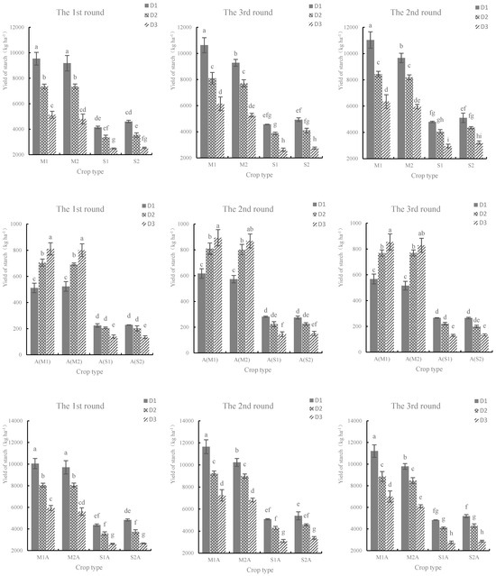 Starch yield of maize/sorghum and alfalfa in 2019–2020 (the 1st round) (R1), 2020–2021 (the 2nd round) (R2), and 2021–2022 (the 3rd round) (R3) including double-cropping systems maize Dongdan 60–alfalfa WL525 (M1–A), maize Dongdan 1331–alfalfa WL525 (M2–A), sorghum 1230–alfalfa WL525 (S1–A), and sorghum cfsh30–alfalfa WL525 (S2–A). D1 represents suitable sowing, D2 represents suitable delayed sowing, and D3 represents late sowing. M1 represents maize Dongdan 60, M2 represents maize Dongdan 1331, S1 represents sorghum 1230, and S2 represents sorghum cfsh30. A (M1) represents alfalfa following the preceding crop of maize Dongdan 60, A (M2) represents alfalfa following the preceding crop of maize Dongdan 1331, A (S1) represents alfalfa following the preceding crop of sorghum 1230, and A (S2) represents alfalfa following the preceding crop of sorghum cfsh30. Means followed by the same letters do not differ by Tukey’s test (p > 0.05).