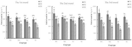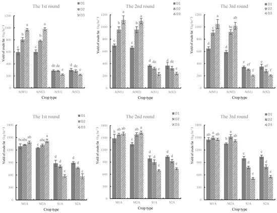 Crude fat yield of maize/sorghum and alfalfa in 2019–2020 (the 1st round) (R1), 2020–2021 (the 2nd round) (R2), and 2021–2022 (the 3rd round) (R3) including double-cropping systems maize Dongdan 60–alfalfa WL525 (M1–A), maize Dongdan 1331–alfalfa WL525 (M2–A), sorghum 1230–alfalfa WL525 (S1–A), and sorghum cfsh30–alfalfa WL525 (S2–A). D1 represents suitable sowing, D2 represents suitable delayed sowing, and D3 represents late sowing. M1 represents maize Dongdan 60, M2 represents maize Dongdan 1331, S1 represents sorghum 1230, and S2 represents sorghum cfsh30. A (M1) represents alfalfa following the preceding crop of maize Dongdan 60, A (M2) represents alfalfa following the preceding crop of maize Dongdan 1331, A (S1) represents alfalfa following the preceding crop of sorghum 1230, and A (S2) represents alfalfa following the preceding crop of sorghum cfsh30. Means followed by the same letters do not differ by Tukey’s test (p > 0.05).