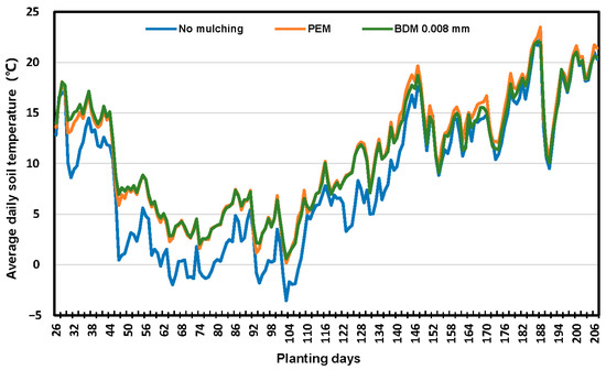 The soil temperature was recorded every half hour using a temperature-measuring probe to determine the average daily temperature under no mulching, PEM 0.008 mm, and BDM 0.008 mm (Figure 1). It was observed that the average daily soil temperature dropped to 0 °C under no mulching on several occasions between 61 and 107 days after sowing, reaching a minimum of −3.6 °C. In contrast, the average daily soil temperature under both PEM 0.008 mm and BDM 0.008 mm was significantly higher than that observed under no mulching, particularly during the winter months from mid-November to mid-March (31 to 149 days after planting). Under the conditions of PEM 0.008 mm and BDM 0.008 mm, the daily average soil temperature was similar, with no significant difference.