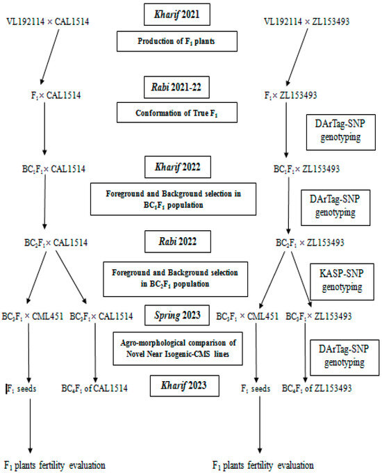 The MABC scheme followed in the present study is shown in Figure 1. Plant crosses between recurrent parents (as pollen donor) and CMS donor parent (as female parent) were carried out during kharif 2021 at the main agricultural research station, University of Agricultural Sciences, Raichur, Karnataka, India. The campus is geographically situated in the north-eastern dry zone (Zone 2) of Karnataka at 16°12″ N latitude and 77°21″ E longitude, with an altitude of 389.37 m above mean sea level. The F1 of both crosses were grown during rabi 2021–2022. The true F1 of both crosses were identified by checking the number of heterozygous allelic loci present across all polymorphic markers in both F1 populations by using 3305 DArTag-SNP genotyping. The true F1′’s of both populations were used as female parent (pollen recipient) in the subsequent backcrossing with their respective recurrent parents (CAL1514 and ZL153493). Seeds obtained from the true F1 plant crosses constitute the BC1F1, which were raised in the field during Kharif 2022, and foreground selection was carried out by phenotypic selection in both populations during the reproductive stage. Background selection was carried out in the foreground selected BC1F1 plants of both populations by using DArTag-SNP genotyping; the plants having the highest percentage of recurrent parent genome recovery (RPGR) were selected and further crossed with their respective recurrent parents to develop BC2F1 and BC3F1 populations during rabi 2022–2023 and spring 2023, respectively.
