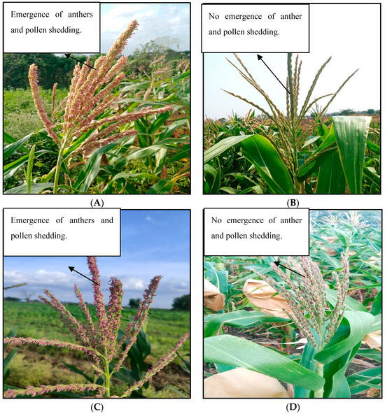 In the present study, foreground selection for CMS trait was carried out by phenotypic selection of male sterile tassel in both backcross populations. Morphological examination of tassels for exertion of anthers and pollen shedding from the tassel in both backcross populations during reproductive stage completes the foreground selection for the CMS trait in the maize crop (Figure 2).