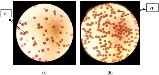 Fertile pollens of F1 plants of RCRMH-2 (a) and RCRMH-3 (b) hybrids visualized by microscope (40×) after acetocarmine staining. All the viable pollen (VP) are stained in colour.