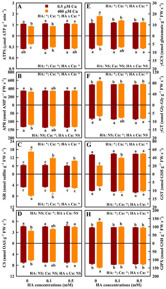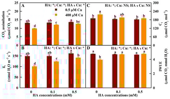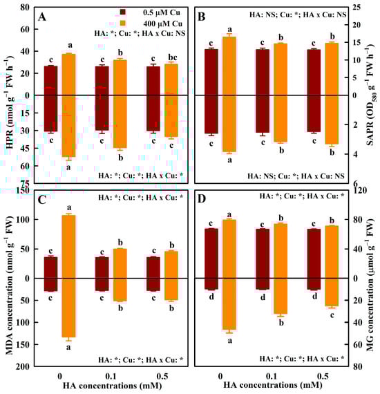 3.1. Humic Acid Supply Reduced the Cu400-Induced Decrement of ACO2, gs, and IWUE in Leaves, as Well as the Increment of SAPR, HPR, MG, and MDA in Roots and Leaves