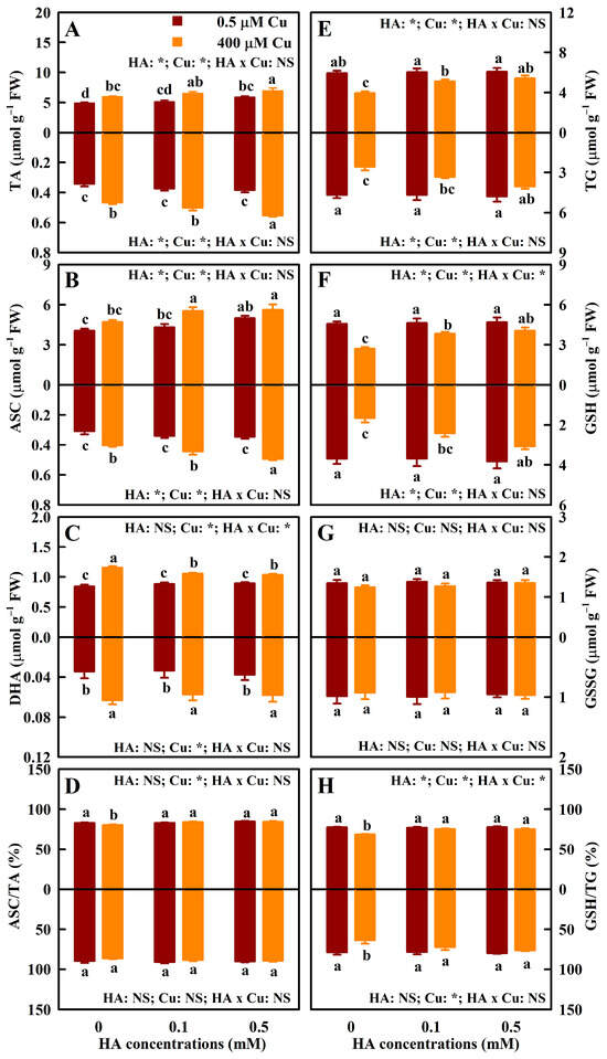 3.3. Humic Acid Supply Reduced Cu400-Induced Alterations in the Concentrations of PCs, MTs, TNP-SH, and Antioxidants, as Well as the Ratios of GSH/TG and ASC/TA in Roots and Leaves