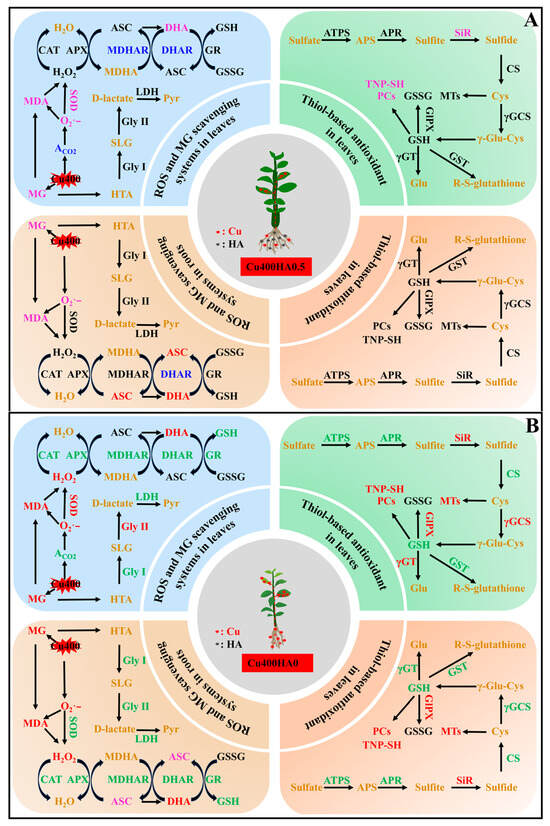 3.4. Principal Coordinate Analysis for Roots and/or Leaves, as Well as the Different Alterations in ROS and MG Production and Detoxification Between Roots and Leaves Caused by Cu400