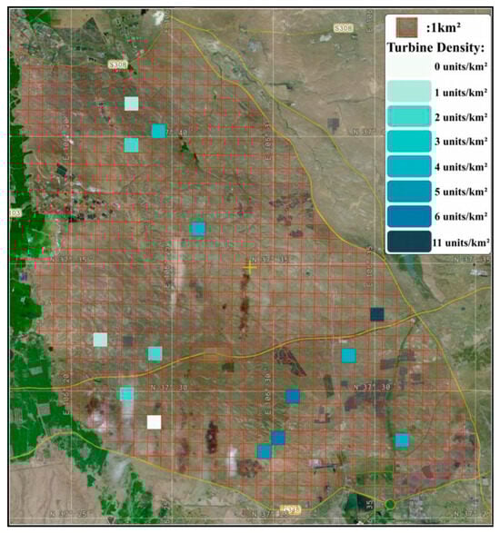 Sampling plots were established through integrated GPS positioning, ArcGIS spatial analysis, and Digital Elevation Model (DEM) processing. A grid-based approach with 1 km2 (1 km × 1 km) resolution was implemented to partition the study area into standardized quadrats (Figure 1), each assigned a unique centroid code (e.g., Plot 550). Wind turbine density was defined as the number of operational turbines per km2, with representative plots categorized accordingly (Figure 2). Seasonal surveys of insect and vegetation diversity were conducted during spring, summer, and autumn of 2024, with one sampling campaign per season. Quadrats were excluded if their effective sampling area fell below 0.5 km2 or contained confounding infrastructure (photovoltaic installations, buildings, national highways, or expressways). A stratified sampling protocol was applied based on turbine density gradients to ensure proportional habitat representation. Through strict adherence to three criteria: (1) homogeneity in wind turbine age, (2) low-relief terrain facilitating field operations, and (3) spatial consistency in turbine distribution patterns. 14 experimental plots were selected in the Taiyangshan Wind Farm. These plots were systematically categorized into eight distinct density gradient types, with specific counts per gradient detailed in Table 1.