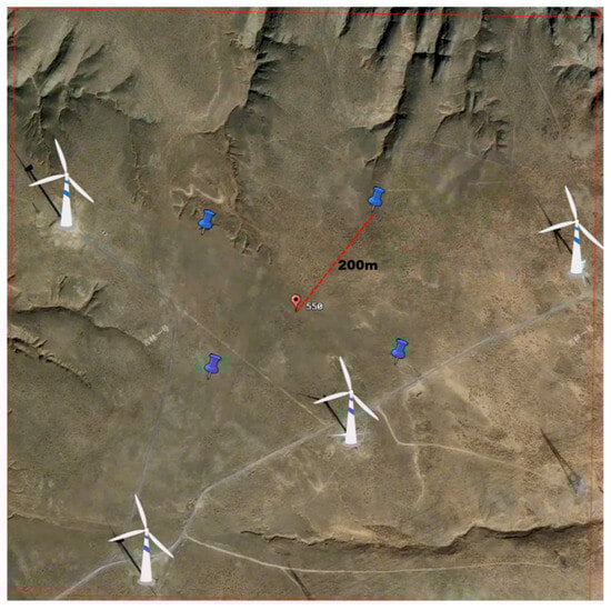 Sampling plots with wind turbine density of 4 units/km2. Note: a central location (marked in red) and four peripheral points positioned 200 m from the center in cardinal directions (marked in blue).