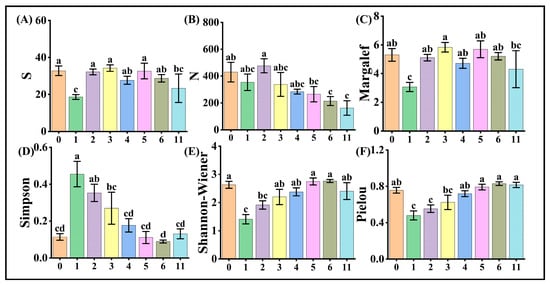 Response of insect diversity indices to wind turbine density in Ningxia Taiyangshan Wind Farm. The X-axis is wind turbine density (turbines/km2), consistently with subsequent figures. Note: (A) is the number of species, (B) is the total number of individuals, (C) is the Margalef richness index, (D) is the Simpson dominance index, (E) is the Shannon–Wiener diversity index, and (F) is the Pielou evenness index. The letters a, b, c, and their combinations (such as ab, abc) above the bar chart are used to visually indicate whether the differences between groups are statistically significant. In the chart, identical letters indicate no significant difference between groups (p > 0.05), while different letters indicate significant differences (p ≤ 0.05). When letters are combined, groups with identical letters show no significant difference, and similarly hereinafter.