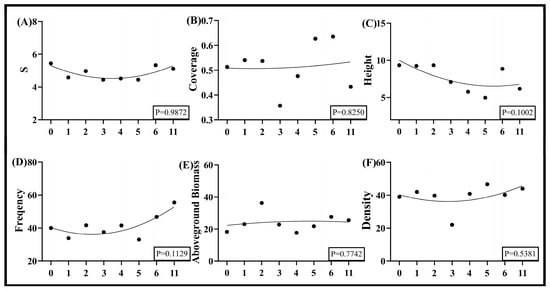 Nonlinear regression analysis of 2024 data from the Taiyangshan Wind Farm demonstrated weak correlations between wind turbine density and vegetation community structural indices. Species richness, frequency, and stem density exhibited non-significant bimodal trends (initial decline followed by increase) with rising turbine density. Among these, frequency displayed a marginally more pronounced increasing trajectory, while species richness and stem density remained in stochastic fluctuations (Figure 6A,D,F). Vegetation height showed a gradual decreasing trend across density gradients (Figure 6C). Coverage and aboveground biomass followed counter-phase patterns: coverage initially decreased, then increased, while biomass first increased, then decreased (Figure 6B,E). Both metrics exhibited statistically indistinguishable magnitudes of variation with horizontal linear patterns (Figure 6B,E).