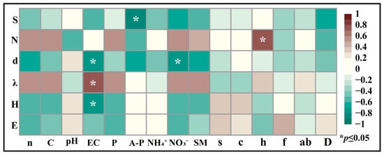 Heatmap of insect diversity correlations with soil nutrients and vegetation structural characteristics in Ningxia. Note: The alpha diversity index of insects is as follows, from top to bottom in the left longitudinal direction. S is the number of insect species, N is the number of insect individuals, d is the richness index, λ is the dominance index, H is the diversity index, and E is the evenness index. The horizontal axis from left to right represents soil nutrients and vegetation community structure characteristics, n is soil nitrogen content, C is soil carbon content, pH is soil pH, EC is soil electrical conductivity, P is soil total phosphorus, A-P is soil available phosphorus, NH4+ is soil ammonium nitrogen, NO3− is soil nitrate nitrogen, and SM is soil moisture content. s is the number of vegetation species, c is vegetation coverage, h is vegetation height, f is vegetation frequency, ab is aboveground vegetation biomass, and D is vegetation density.