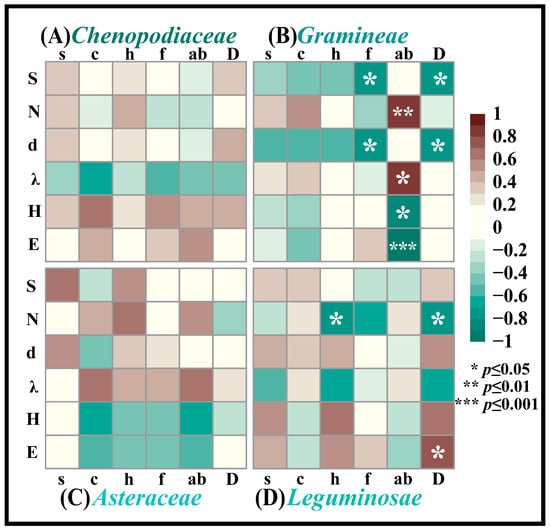 Heatmap of insect diversity associations with dominant plant community characteristics in Ningxia. Note: (A) is the heatmap of insect diversity associations with Chenopodiaceae plant community characteristics, (B) is the heatmap of insect diversity associations with Gramineae plant community characteristics, (C) is the heatmap of insect diversity associations with Asteraceae plant community characteristics, and (D) is the heatmap of insect diversity associations with Leguminosae plant community characteristics. The alpha diversity index of insects is as follows, from top to bottom in the left longitudinal direction. S is the number of insect species, N is the number of insect individuals, d is the richness index, λ is the dominance index, H is the diversity index, and E is the evenness index. The horizontal axis from left to right represents the structure characteristics of the vegetation community. s is the number of vegetation species, c is vegetation coverage, h is vegetation height, f is vegetation frequency, ab is aboveground vegetation biomass, and D is vegetation density.
