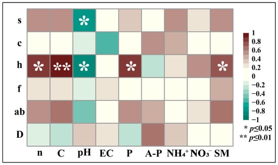 Heatmap of vegetation-soil nutrient linkages in Ningxia. Note: The vegetation community structure characteristics are as follows, from top to bottom in the left longitudinal direction. s is the number of vegetation species, c is vegetation coverage, h is vegetation height, f is vegetation frequency, ab is aboveground vegetation biomass, and D is vegetation density. The horizontal axis from left to right represents soil nutrients. n is soil nitrogen content, C is soil carbon content, pH is soil pH, EC is soil electrical conductivity, P is soil total phosphorus, A-P is soil available phosphorus, NH4+ is soil ammonium nitrogen, NO3− is soil nitrate nitrogen, and SM is soil moisture content.