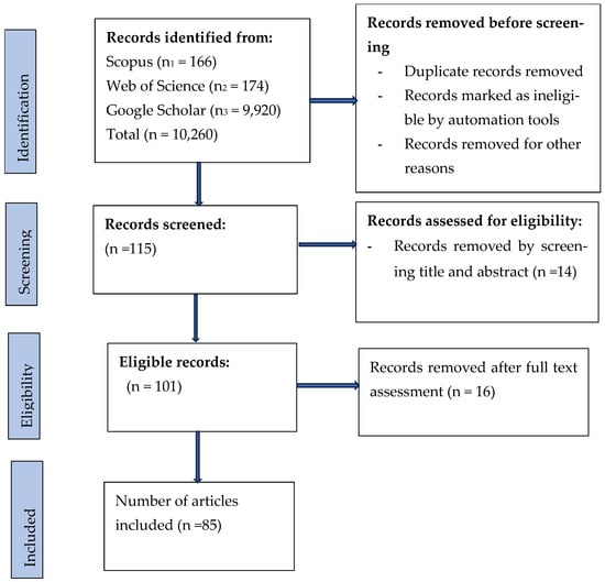 The selection process followed PRISMA guidelines and consisted of multiple phases. After removing duplicate and ineligible records using automated tools and manual checks, 115 articles were retained for abstract screening. Fourteen of these were excluded due to a lack of relevance based on the titles and abstracts. The remaining 101 articles underwent full-text evaluation, where 16 additional studies were removed for not meeting the inclusion criteria. Ultimately, 85 articles were identified as eligible and were included in the final analysis.