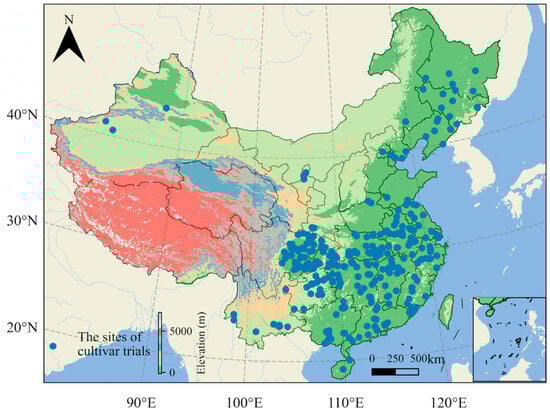 The study area encompasses China’s rice cultivation regions, with trial sites distributed as shown in Figure 1. These sites span six major rice-producing zones across China, characterized by pronounced heterogeneity in edaphoclimatic conditions, socioeconomic conditions, and rice cultivation systems. Those zones are the South China double-season rice region, Central China mixed single-season and double-season rice region, Southwest Plateau mixed single-season and double-season rice region, North China single-season rice region, Northeast single-season rice region, and Northwest arid single-season rice region. The study area domain extends latitudinally from 19°09′ N to 46°40′ N and longitudinally from 80°07′ E to 130°30′ E, with elevational gradients ranging from 1 to 1318 m. This extensive geographical expanse encompasses diverse climatic conditions spanning tropical, subtropical, and temperate bioclimatic zones. During the main rice growing season (March–November), a significant spatiotemporal fluctuation in meteorological conditions is observed. The climate conditions across the study area are highly heterogeneous, with multi-year daily mean temperature, daily maximum temperature, and daily minimum temperature during the growing season at all trial sites varying from 9.0 °C to 27.1 °C, 13.8 °C to 29.7 °C, and 4.6 °C to 25.3 °C, respectively; accumulated rainfall varying from 25 mm to 2812 mm; average daily relative humidity varying from 26.82% to 84.15%; and accumulated net solar radiation varying from 2482 MJ·m−2·d−1 to 4622 MJ·m−2·d−1.
