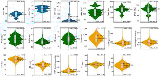 Visualization of the variable distribution in rice cultivar trials dataset. Variables are categorized and indicated by different colors—blue (geographical factors), green (phenological factors), and orange (cultivar traits).