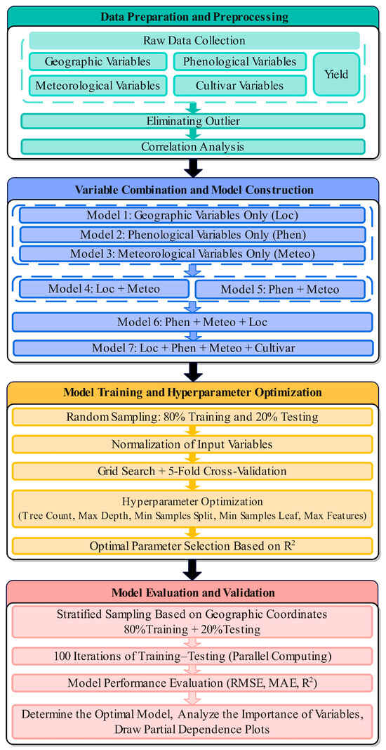 The random forest regression algorithm, as a powerful nonparametric statistical method, is used to handle complex nonlinear relationships of multidimensional data to predict crop yields. In the data preprocessing phase, the interquartile range (IQR) method is utilized to identify and remove yield outliers, specifically eliminating values below Q1 − 1.5 × IQR or above Q3 + 1.5 × IQR to ensure dataset integrity and reliability. Additionally, the 2175 rice cultivars are categorical variables (fields) rather than quantitative variables (numerical values). To enable the model to properly handle this categorical feature within the analytical framework, each cultivar is encoded with a unique identifier. The approach allows the model to capture cultivar-specific effects without imposing any numerical ordering or relationship between different cultivars.
