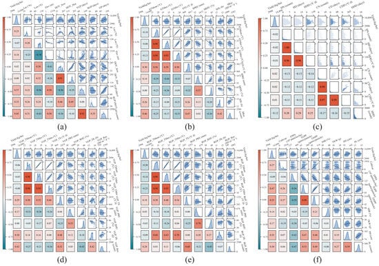 Correlation analysis between influencing factors and rice yield. Panels show correlations of (a) geographical location, phenology, and yield; (b) meteorological factors during the whole growth period (GP); (c) meteorological stress indicators during GP; (d) meteorological factors during the vegetative growth phase (VGP); (e) meteorological factors during the reproductive growth phase (RGP); and (f) cultivar traits. Diagonal plots present histograms and kernel density estimates. Variables include location (Lon, Lat, and Elev), phenology (DOY_Sow, DOY_Hea, VGP, RGP, and GP), meteorological factors (TMin, TMax, TMean, PRE, RHU, Rns, DL, and TS), stress indicators (HN, HD, HDD, CN, CD, CDD, and HHD), and cultivar traits (EPPA, TGPP, FGPP, SSR, TGW, PH, and PL). The dashed lines represent the fitting lines of the data points. All variable abbreviations and descriptions can be found in Table A1.