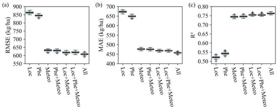 From the coefficient of determination (R2, Figure 5c) perspective, different feature combinations show markedly different explanatory powers. Using only geographical variables (Loc), R2 reaches 0.52, indicating weak independent predictive capacity. When only meteorological variables (Meteo) are used, R2 significantly increases, approaching 0.75. With each addition of input variables, R2 increases progressively. The combinations Loc + Meteo, Phen + Meteo, and Loc + Phen + Meteo all achieve R2 ≥ 0.75, providing robust predictions of rice yield variation. Including all variables (All) pushes R2 to its maximum of 0.77. This shows that adding cultivar information to climate and phenological factors enhances overall accuracy and stability, yet cultivar data alone can lead to inaccurate yield estimates in large-scale predictions.