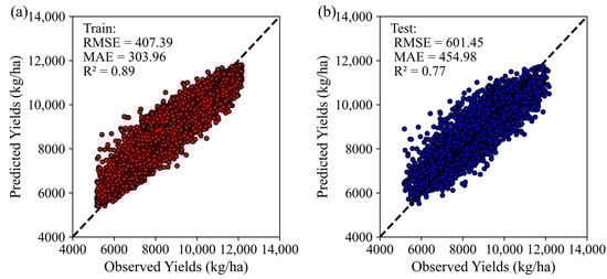 Using the random forest model, rice yield is predicted from all features—geographic location (Loc), phenological factors (Phe), meteorological factors (Meteo), and cultivar characteristics (Cultivar). The model uses optimal parameters: maximum depth = 20, feature selection via the square root of the total number of features, minimum samples per leaf = 4, minimum samples to split = 10, 300 trees, and bootstrap = True. After 100 random splits, the best-performing run is displayed in Figure 6. On the training set, the model explains 89% of the variance, with RMSE = 407.39 kg/ha and MAE = 303.96 kg/ha. On the test set, it explains 77% of the variance, with RMSE = 601.45 kg/ha and MAE = 454.98 kg/ha.