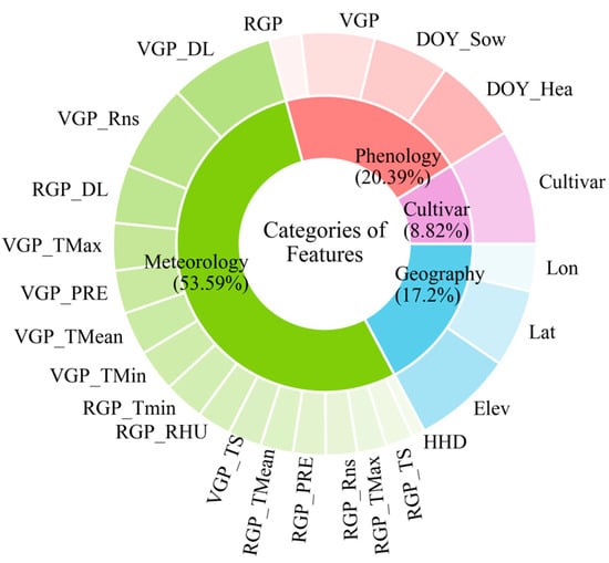 Figure 7 presents the relative importance of yield-influencing features based on optimal parameters and the best full-factor model (the importance of each variable in all models can be referred to in the Table A3). Environmental variables account for the largest proportion (53.59%), followed by phenological variables (20.39%), geographic location variables (17.20%), and cultivar (8.82%). Among individual predictors, rice cultivar itself emerges as the single most critical factor. During VGP, daylength (VGP_DL, 8.07%) and net solar radiation (VGP_Rns, 6.69%) play significant roles in the process of yield formation. Additionally, key phenology events, including sowing date (DOY_Sow, 5.81%) and heading date (DOY_Hea, 6.55%), make substantial contributions to yield. Geographic characteristics such as elevation (Elev, 7.65%), latitude (Lat, 5.93%), and longitude (Lon, 3.64%) also demonstrate high importance. A closer look at meteorological variables across development periods reveals distinct requirements: during VGP, maximum temperature (VGP_TMax, 3.62%), accumulated precipitation (VGP_PRE, 3.30%), average temperature (VGP_TMean, 3.30%), and minimum temperature (VGP_TMin, 3.21%) demonstrate significant importance. In contrast, during RGP, minimum temperature (RGP_TMin, 3.09%) emerges as particularly important for yield prediction. These findings indicate that rice has different meteorological requirements during VGP and RGP. During the VGP, rice requires more sunlight and solar radiation, while during the RGP, yield is mainly affected by low temperatures. Overall, yield is governed by the integrated effects of cultivar, sowing date, meteorological conditions, and geographic factors. Cultivar exerts the strongest individual effect, while the sowing date interacts with meteorological variables to shape the final yield.