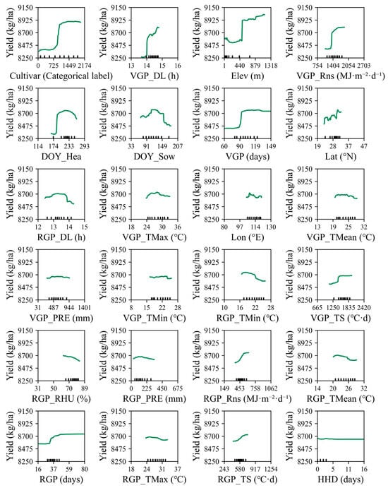Partial dependence plots based on the importance of variables. Elev (elevation, m), Lat (latitude, °N), Lon (longitude, °E), DOY_Sow (the day of year for sowing date), DOY_Hea (the day of year for heading date), VGP (the vegetative growth period, days), RGP (the reproductive growth period, days), TMin (minimum temperature, °C), TMax (maximum temperature, °C), TMean (average temperature, °C), PRE (accumulated precipitation, mm), RHU (relative humidity, %), Rns (net solar radiation, MJ·m−2·d−1), DL (daylength, h), TS (≥8 °C thermal summation, °C d), and HHD (total days of high heat and high humidity, days). Cultivar represents the classification identifier and shows the impact on the yield. The major tick marks indicate coordinate values, while the minor tick marks represent data points.
