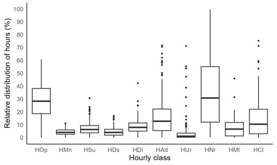 The HNr (unrecorded) category had a median of 30.8% and high variability, highlighting serious problems in data collection and, consequently, in monitoring work hours. The high dispersion in the HNr and HUr categories may be related to data recording errors, interruptions in the temporal sequence of events, coding issues, or operational inconsistencies. Identifying the root causes of these errors is essential for improving data reliability and, consequently, operational management.