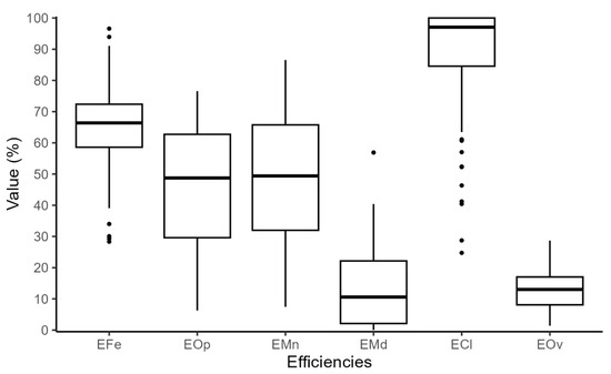 Overall efficiency (EOv) measures how much of the day was used to perform the operation for which the equipment was designed (Equation (A10)).