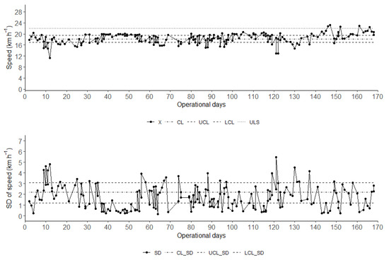 Speed (km h−1) during operating hours (HOp) over the evaluated period (control chart by variable sample—mean and standard deviation). X = mean speed; CL = center line; UCL = upper control limit; LCL = lower control limit; ULS = upper specification limit (defined by the company, 22.0 km h−1); SD = standard deviation of speed; CL_SD = center line for SD; UCL_SD = upper control limit for standard deviation; LCL_SD = lower control limit for standard deviation.