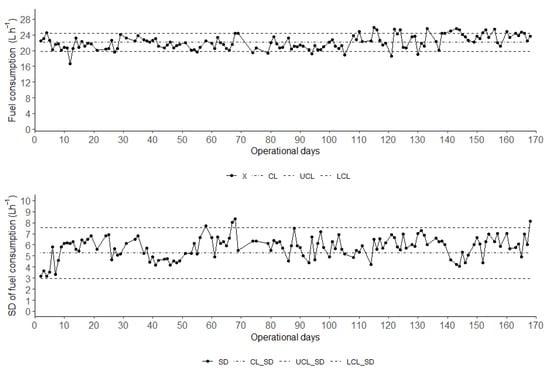 Fuel consumption (L h−1) of the sprayers (set) in operating hours (HOp) over the evaluated period, eliminating special causes (control chart by variable sample—mean and standard deviation). X = mean speed; CL = center line; UCL = upper control limit; LCL = lower control limit; SD = standard deviation of speed; CL_SD = center line for SD; UCL_SD = upper control limit for standard deviation; LCL_SD = lower control limit for standard deviation.