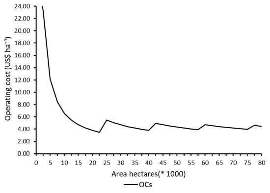 Figure 5 presents the relationship between the operational cost per hectare (OCs, US$ ha−1) and the total area sprayed, expressed in thousand hectares. For areas smaller than 15,000 hectares, the OCs present high values, above 21.24 US$ ha−1, decreasing sharply as the sprayed area increases.