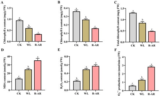 Fluctuation in the chlorophyll a content (A), chlorophyll b content (B), total chlorophyll content (C), malondialdehyde (MDA) content (D), H2O2 content (E) and O2•− production rate (F). Data are shown with standard deviation. Different letters denote significant differences at p < 0.01. CK, control condition; WL, waterlogging stress; R-AR, removal of adventitious roots.