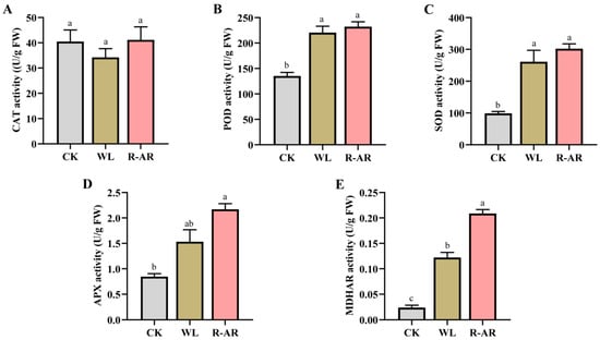 Fluctuation in the catalase (CAT) activity (A), peroxidase (POD) activity (B), superoxide dismutase (SOD) activity (C), ascorbate peroxidase (APX) activity (D) and monodehydroascorbic acid reductase (MDHAR) activity (E). Data are shown with standard deviation. Different letters denote significant differences at p < 0.01.