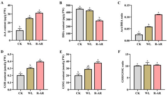 Fluctuation in the ascorbic acid (AsA) content (A), dehydroascorbic acid (DHA) content (B), AsA/DHA ratio (C), glutathione (GSH) content (D), oxidized glutathione (GSSG) content (E) and GSH/GSSG ratio (F). Data are shown with standard deviation. Different letters denote significant differences at p < 0.01.
