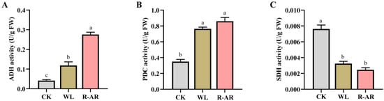 The enzyme activities of POD, SOD, CAT, APX, MDHAR, succinate dehydrogenase (SDH), alcohol dehydrogenase (ADH) and pyruvate decarboxylase (PDC) were measured using corresponding commercial detection kits (Solarbio, Beijing, China). Following the manufacturers’ instructions, approximately 0.1 g of root samples from each treatment were pulverized in liquid nitrogen and immediately homogenized in the extraction solutions. The activity of POD was assessed by measuring the increase in absorbance at 470 nm due to the oxidation of guaiacol [23]. SOD activity was determined by evaluating its inhibition of superoxide radicals at 450 nm [24]. CAT activity was evaluated by monitoring the breakdown of H2O2 at 240 nm over a duration of 1 min [25]. APX catalyzes the oxidation of AsA by H2O2, and its activity was calculated by measuring the oxidation rate of AsA at 290 nm [26]. MDHAR activity was determined by quantifying the rate of absorbance decline at 340 nm [22]. SDH activity was represented by changes in absorbance at 600 nm [27]. The activities of ADH and PDC were monitored by detecting the oxidation of NADH, reflected by a decrease in absorbance at 340 nm [21,28].