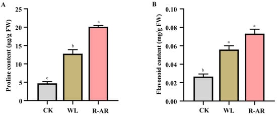 Fluctuation in the proline content (A) and flavonoid content (B). Data are shown with standard deviation. Different letters denote significant differences at p < 0.01.