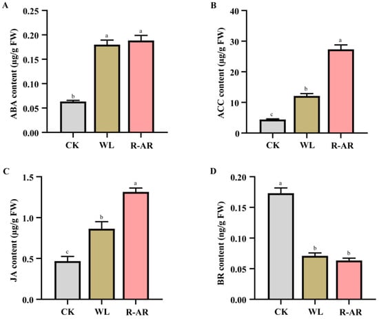Fluctuation in the abscisic acid (ABA) content (A), 1-aminocyclopropane-1-carboxylic acid (ACC) content (B), jasmonic acid (JA) content (C) and brassinolide (BR) content (D). Data are shown with standard deviation. Different letters denote significant differences at p < 0.01.