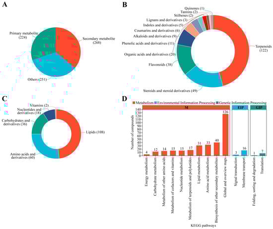 Phytochemical classification (A–C) and KEGG functional pathway (D) of the detected metabolites.