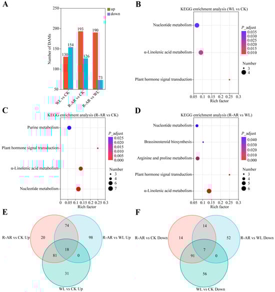 A survey of differentially accumulated metabolites (DAMs). (A) Statistical histogram of DAMs. (B) KEGG enrichment analysis of WL vs. CK comparison group. (C) KEGG enrichment analysis of R-AR vs. CK comparison group. (D) KEGG enrichment analysis of R-AR vs. WL comparison group. (E) Venn diagram of up-regulated DAMs among the three comparison groups. (F) Venn diagram of down-regulated DAMs among the three comparison groups.