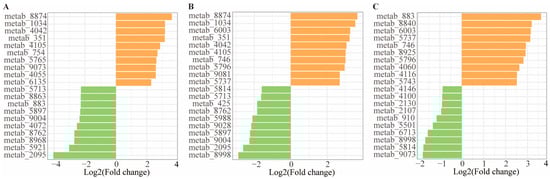 Top fold change metabolites with significantly up-regulated and down-regulated in WL vs. CK comparison group (A), R-AR vs. CK comparison group (B) and R-AR vs. WL comparison group (C). The orange bars indicate up-regulated metabolites, while the green bars indicate down-regulated metabolites.