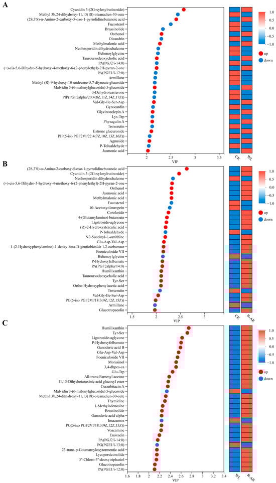 Metabolites with top variable importance in projection (VIP) scores in WL vs. CK comparison group (A), R-AR vs. CK comparison group (B) and R-AR vs. WL comparison group (C).