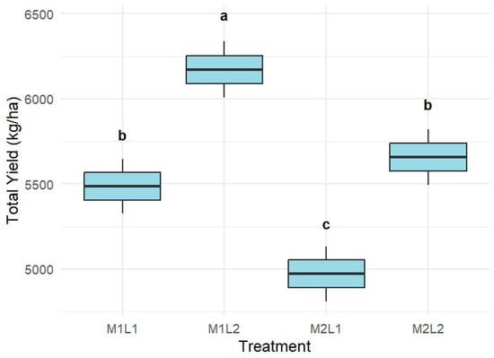 Effect of different irrigation and planting treatments on total yield of faba bean. Different letters above boxplots indicate statistically significant differences at p < 0.05 according to Tukey’s HSD test. treatment combinations: M1L1 = 25% MAD, single-row, M1L2 = 25% MAD, double-row, M2L1 = 50% MAD, single-row and M2L2 = 50% MAD, double-row.