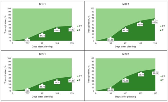 Figure 2 illustrates the percentage of T in total ET for the four treatment combinations, as estimated using the LAI-based model. The proportion of transpiration varied across the growing period, reflecting the effects of canopy development on water use dynamics. Absolute accumulated values of E and T at different growth stages are provided in Supplementary Material Table S5. For example, at day 135, M2L1 recorded 5.49 cm of E and only 4.36 cm of T, whereas M1L2 recorded 2.96 cm of E and 6.89 cm of T, reflecting the contrasting canopy development and shading effects.