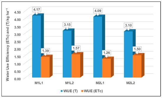 When considering WUE (ETc), which includes the entire crop water supply, the ranking of treatments differed. The highest system-level WUE (ETc) was recorded in M1L2 (1.57 kg m−3), followed by M2L2 (1.50 kg m−3). These double-row treatments, especially under the more frequent irrigation regime, showed better conversion of total water input into yield. In contrast, M2L1 had the lowest WUE (ETc) (1.26 kg m−3), suggesting that while it was physiologically efficient (high WUE (T)), it was less efficient when total water inputs were considered.