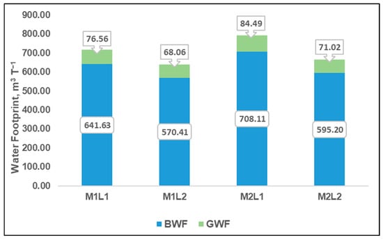 Among all treatments, M1L2 consistently had the lowest total water footprint (BWF + GWF = 638.47 m3 ton−1), indicating superior overall water productivity. In contrast, M2L1 had the highest combined footprint (792.60 m3 ton−1), reflecting both lower yield and higher evaporative losses due to sparse canopy and less frequent irrigation.